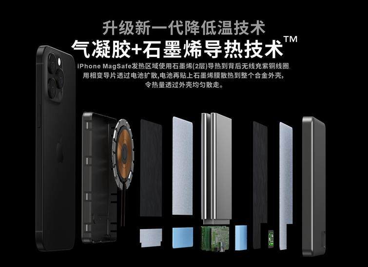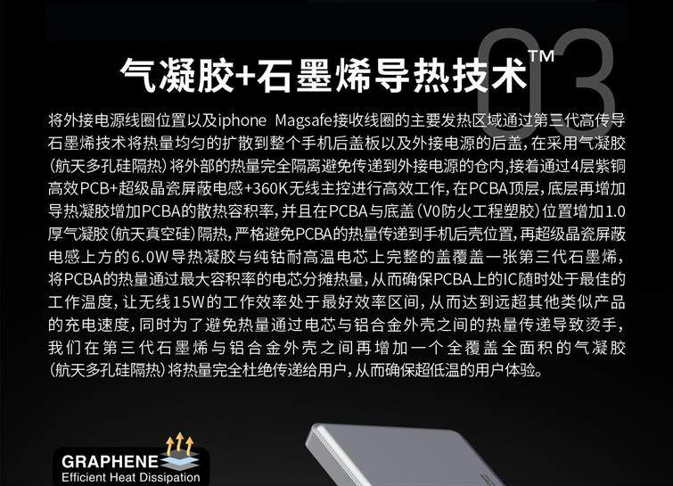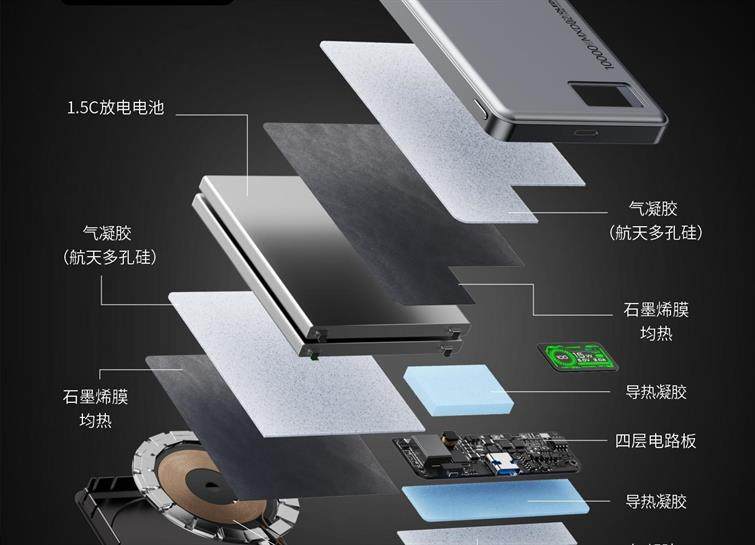 Aerogel + graphene heat dissipation, stays under 37°C