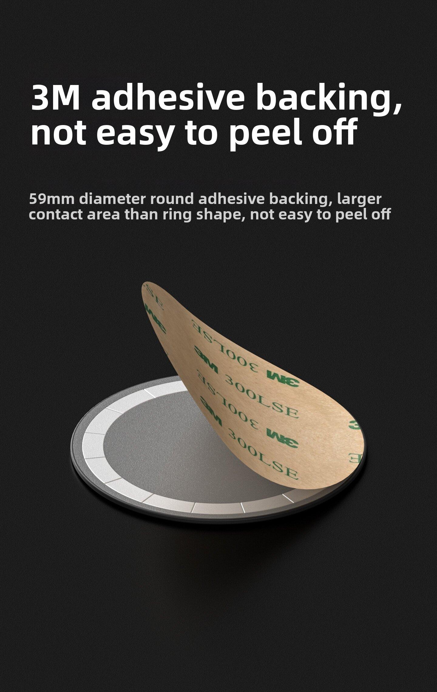 Equipped with a large 59 mm diameter circular 3M adhesive — bigger contact area than ring adhesives — providing a stronger hold and less chance of peeling off.